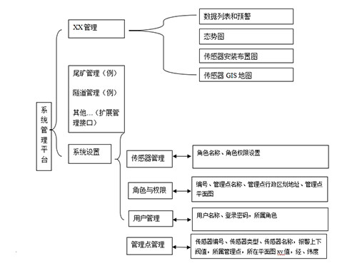 例如隧道管理、尾礦庫管理,系統(tǒng)預留接口,每增加一樣管理類型,就直接增加模塊到主界面。點擊XX管理后,會列出所有管理點的名稱,也可以通過行政區(qū)劃來查找管理點名稱,例如,查找湘西自治州花垣縣,然后列出花垣縣下面所有管理點。點擊管理點,出現(xiàn)子菜單: