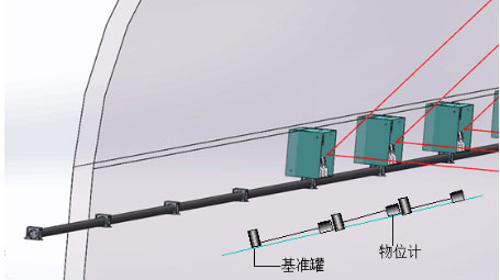 4.確定合適的基準(zhǔn)點(diǎn):物位計(jì)的基準(zhǔn)點(diǎn)設(shè)置以仰拱作基點(diǎn)或安裝在穩(wěn)定的初支上,將基準(zhǔn)罐抬升到與物位計(jì)相同高度,保證測(cè)量精度,每一個(gè)段面一個(gè)物位計(jì)與一個(gè)基準(zhǔn)罐,是一個(gè)獨(dú)立的系統(tǒng),方便安裝與拆卸。示意圖如下: